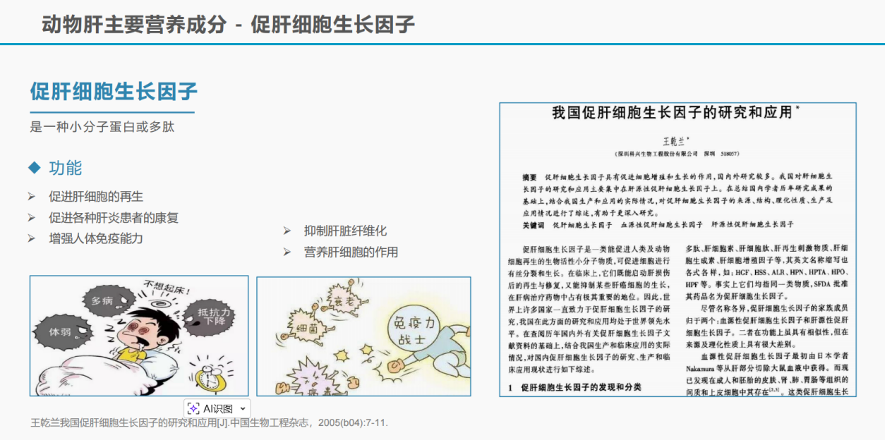 那么,肝蛋白肽是什么呢?简单来说,它就是从健康动物肝脏中,利用现代生物技术(如酶解、纯化、冻干)提取出的具有护肝活性的小分子肽混合物。它富含小分子活性肽、多种氨基酸、B族维生素以及铁、硒等微量元素,是一种天然、安全的肝脏养护成分,主要作用是帮助修复肝细胞、调节肝脏代谢、增强解毒能力。